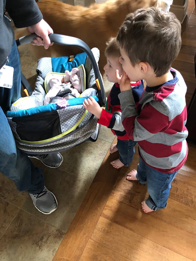 Oh my goodness, beautiful baby girl. Such precious pictures of the boys taking her in–She is gorgeous with the prettiest face and look at that hair color—she’ll be the princess for sure.