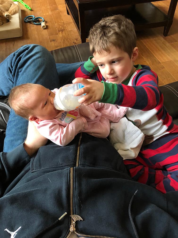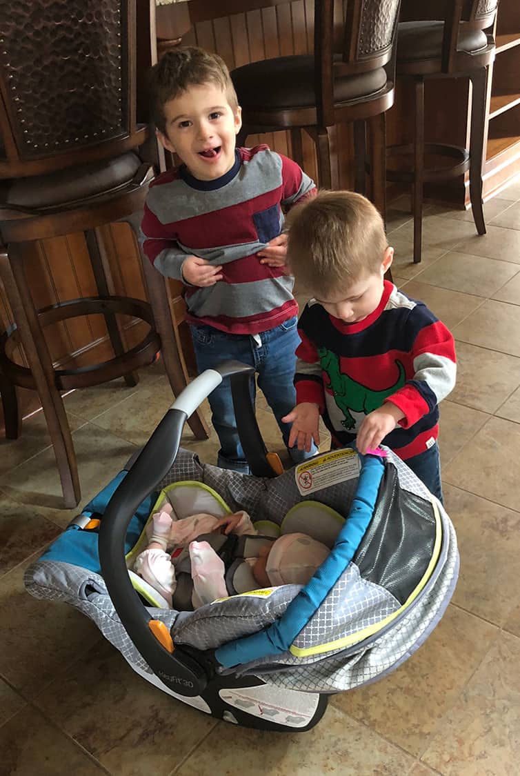 Joseph is absolutely smitten with her and wants to kiss her, sit next to her, and help however he can. Dominic is very curious and likes pointing out her nose, ears, hair and toes, ha!