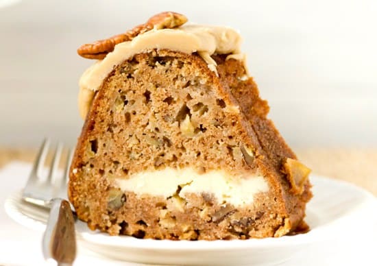 This apple Bundt cake is loaded with spice, pecans, has a huge cream cheese swirl in the middle, and is topped with a praline frosting.
