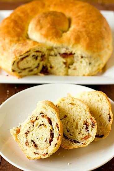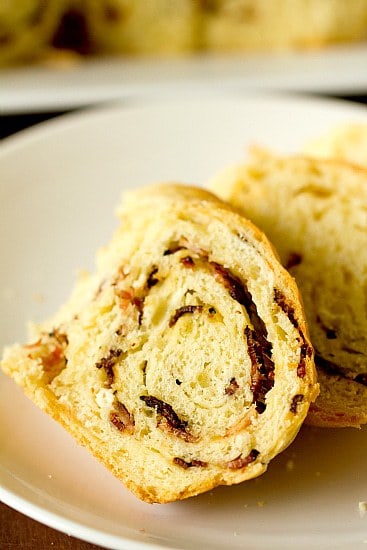 Once you have the cheese and bacon in place, you roll it up jelly roll-style into a thick log. I never knew this, but my mom told me that my grandma always baked these loaves in pie plates, which helped them keep their round, spiral shape. Genius! You very gently coil the roll of dough into a pie plate and let it raise until about doubled in size. Then all that’s left is to bake and eat!
