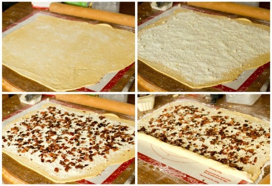 - Working with one piece of dough at a time, roll it out very thin, into a large rectangle about 12x24-inches. Sprinkle the dough with half of the cheese, and then with half of the bacon, leaving a half inch border around all of the edges.