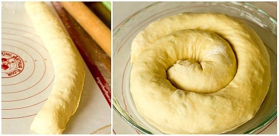 - Starting with a long end facing you, roll the dough up into a tight cylinder jelly roll-style, pinching the seams and ends to seal. Once you have finished rolling the dough, gently coil it into a spiral into a pie plate. Repeat with the second piece of dough.
