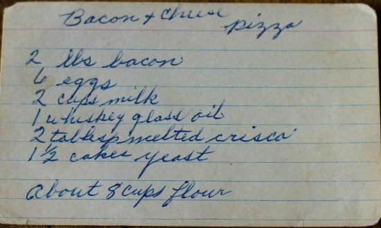 Second, this is a recipe for “Bacon + Cheese Pizza”. Do you see an ingredient listing for cheese? One of the two primary ingredients? Nope. I asked my mom earlier this week why it was missing and how much was needed. She said it was because my grandma never measured the cheese, she just sprinkled it on the dough until she felt like there was enough.