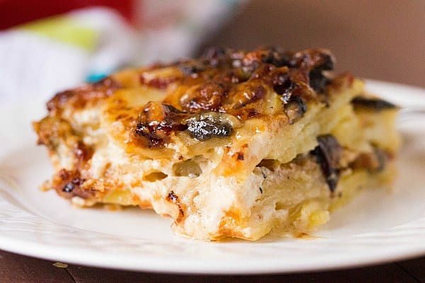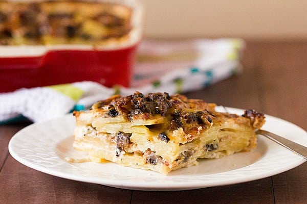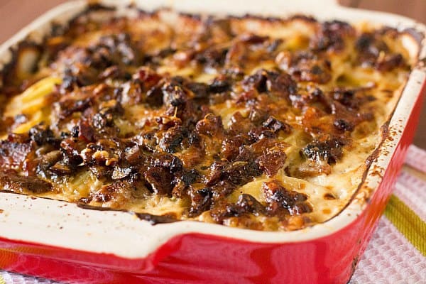 This gratin is prepared in a somewhat similar fashion to traditional scalloped potatoes, with the main difference being the cream sauce is not as rich here and less of it is used, so it is primarily soaked up by the potatoes, leaving you with a layered potato casserole. Not only are there potatoes; there are also two distinct layers of a bacon/mushroom mixture and loads of Gruyère cheese. The dish is baked until everything on top is golden brown and bubbling, which we all know means crusty, cheesy, melt-in-your-mouth deliciousness.