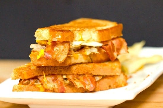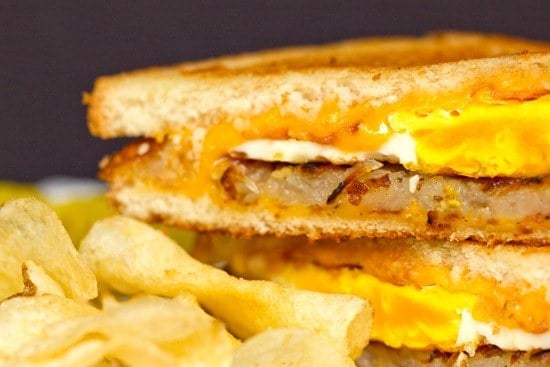 Grilled cheese sandwiches have to be in the top five list of best comfort foods in the entire world. Just one bite and I feel like a kid again! Whether it was dipping a grilled cheese into a bowl of tomato soup or nibbling on one while laying on the couch suffering through a cold, there’s not much that could make you feel better than a hot grilled cheese sandwich. Back in the glory days of Nintendo, grilled cheese sandwiches were quite simply two pieces of white bread with a piece of American cheese slapped in the middle. Sometimes I would get crazy and add pepperoni, but otherwise, that was your basic grilled cheese. Today’s grilled cheese sandwiches most definitely take things a step or two farther. We are living in the age of the gourmet grilled cheese, folks. They’re the next macaron. From guacamole to pesto and French onion soup, the limit is truly your own imagination. Well, I imaged a big plate of my favorite breakfast foods, and then piled it high on a grilled cheese sandwich. Fried eggs, bacon, hash browns and toast are pretty much breakfast nirvana for me; throw in some sharp cheddar cheese and you have one heck of an epic sandwich.