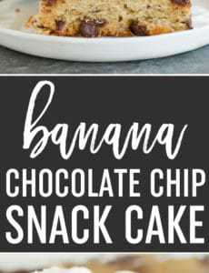 This banana snack cake is fluffy and moist, loaded with chocolate chips, and topped with a simple cream cheese frosting. It’s easy to make, which makes it perfect for last-minute company or an after-school snack!