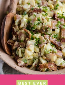 This BEST EVER Potato Salad (with bacon!) is straight from grandmaโs recipe box! It isย easy,ย creamy, and loaded with bacon, and a secret ingredient in the dressing puts it over the top. It converted me to being a potato salad lover! Please don't go through the entire summer without making this at least once!