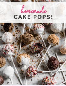I’m going to take you through the ins and outs of how to go about making cake pops completely from scratch, using homemade cake and homemade frosting, and then how to assemble these for picture-perfect cake pops. While none of the components are inherently hard, they do take a bit of time to form into balls, chill, and do all of that dipping! If you are short on time you can go the route of boxed cake and canned frosting but I think the from-scratch cake and frosting tastes a million times better.