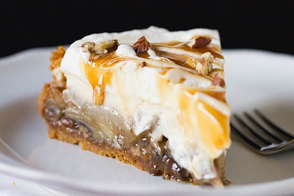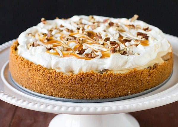 The result is an insanely delicious pie that tastes like a combination of some of the best fall desserts. The caramel and pecan layer on the bottom has a similar flavor to pecan pie, followed by apple pie, then cheesecake, then a cream pie topping with the fresh whipped cream. Itโs utterly amazing and a dessert not to be missed. This is perfect if youโre looking for something a little outside of the box when it comes to Thanksgiving dessert!