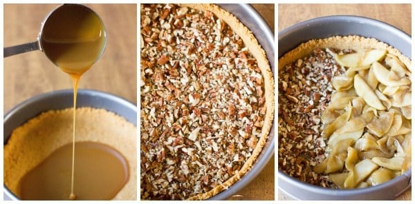 - Pour the salted caramel sauce over the bottom of the crust, gently spreading it into an even layer. Sprinkle the chopped pecans evenly over top of the caramel layer. Place the pan in the refrigerator while the apples are prepared.