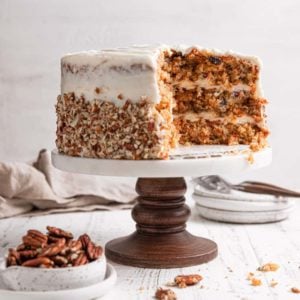 I have made my share of different carrot cake recipes over the years, but none can hold a candle to this one; it is the gold standard as far as Iโm concerned. The cake is subtly spiced, super moist, and packed with tons of extras like pineapple, coconut, raisins, and pecans. Last but not least, itโs filled and frosted with my all-time favorite cream cheese frosting. Itโs a winner on every level and the best carrot cake recipe youโll ever try, guaranteed. Make it for Easter, Thanksgiving, or anytime you need a special cake!