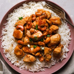 • Slow Cooker: To make this in a slow cooker, simply brown the chicken in step #3 (it does not need to be cooked the whole way through) and add it to the bottom of a slow cooker. Stir together the sauce ingredients, including the cashews and white parts of the green onion, and pour it over the chicken. Cook on low for 3 to 4 hours. Serve as suggested.