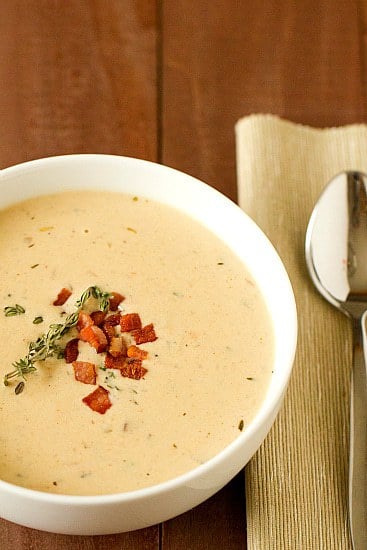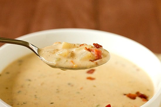 Iโve been wanting to try a creamy potato soup for seemingly ever, and finally went about a search with my first stop being my favorite soup resource, the The Best Soups and Stews, which is written by the editors of Cookโs Illustrated magazine. They had a basic cheddar cheese soup in the book, with a couple of different variations โ one that included bacon and another that included potato and beer. Itโs no secret that Iโm a carbaholic (hello, potatoes!), that bacon makes everything better, and that beer in food is usually always awesome, so I went about combining each of the elements I liked from all of the variations into one utterly amazing soup.
