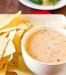 The parade of Mexican-inspired food for Cinco de Mayo continues! I don’t know about you, but I find it nearly impossible to celebrate a holiday or throw a party without including at least one type of dip. Dip is where it’s at, right? There’s nothing better than plunging a chip into a creamy, cheesy bowl of deliciousness. The cheesier, the better, which is what makes queso so darn addicting. As you may have guessed from its name, it includes lots and lots of cheese. This is sometimes known simply as “queso” on some restaurant menus, but the concept is the same – a bowl of melted cheese along with chiles and tomatoes. While the shortcut method to chile con queso is usually a block of Velveeta and a can of Rotel, I’ve often times nuked cream cheese and salsa together. No doubt about it – this from-scratch chile con queso puts both of those to shame. It’s thick, creamy, smooth, and packed with flavor and a little a spice.