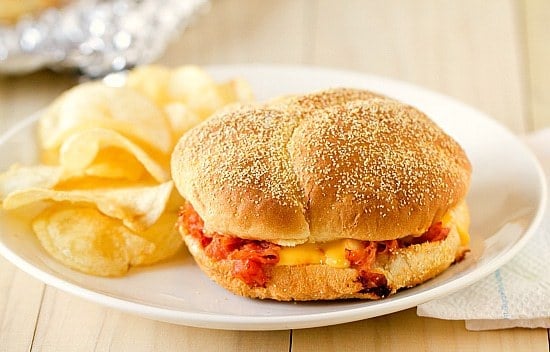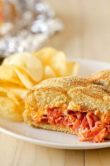 These are easy to throw together, which makes them perfect for serving a hungry crowd. Just mix together the sandwich ingredients, assemble them on the buns, wrap each one in foil and pop in the oven for 30 minutes. They come out warm, gooey thanks to the melted cheese, and with the buns having just a touch of crunch. They would be great for the Super Bowl, or any time youโre having some friends over and want something warm, but easy and casual.