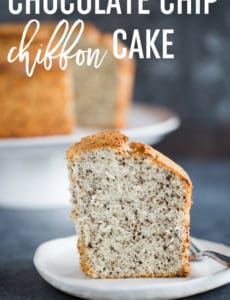 Did you grow up with them? Did your mom or grandma always bake them? Truth be told, I canโt remember ever having eaten a single bite of a chiffon cake until I made THIS cake. My mom claims that my great aunt used to make a special lemon cake that was either a chiffon or sponge when we would visit her in Kenosha, Wisconsin over the summer when we were kids. I have zero recollection of that cake, but what I DO know is that THIS chocolate chip chiffon cake is all sorts of gorgeous and delicious.