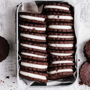 Have you ever wondered if it was possible to make Oreos at home? The answer is a resounding YES! These homemade Oreos are easier than you think, with a dark chocolate wafer cookie and creamy, somewhat stiff filling that will make you wonder why you never tackled chocolate sandwich cookies at home before! As someone who loves to incorporate Oreos into recipes whenever possible, I am here to tell you that they are even BETTER than store-bought, so get a big glass of milk ready and letโs bake!