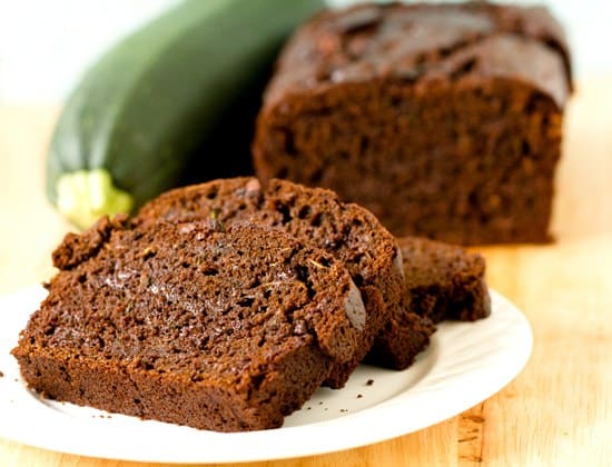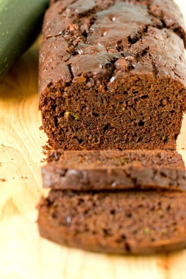The massive zucchini rush (too bad it’s not a gold rush, right?!) has slowed down in the garden, but I’m still picking at least one every couple of days. That’s more than enough zucchini to eat and still have some left for baking experiments! I’ve done my fair share of zucchini bread, from a traditional version, to my grandma’s recipe with pineapple, walnuts and dates, and even zucchini cornbread. While I have seen tons of recipes for zucchini bread fused with chocolate, I just couldn’t wrap my head around it. Believe it or not, given my disdain for most vegetables, I actually like zucchini bread… And we all know I positively love chocolate, but for some reason I just couldn’t envision these two worlds mashing together in a positive way. It’s a good thing I got desperate with the zucchini that was sitting around and wanted to try a new recipe, or else I wouldn’t have finally given in to the chocolate and zucchini marriage. I definitely went into this recipe skeptical and was proven way wrong on all accounts. This bread is utterly amazing – it’s rich, sweet, moist and oozing with chocolate flavor. I am a skeptic no more. Bring on the chocolate zucchini goodness!
