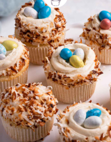 These light and fluffy coconut cupcakes are bursting with bright coconut flavor! With ground shredded coconut, coconut milk, and coconut extract, these cupcakes have it all. Topped with coconut frosting, toasted shredded coconut, and malted candy eggs, these adorable cupcakes make the perfect Easter and springtime treat!