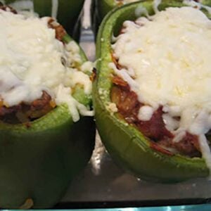 hi, I have a recipe that is similar to this. the differences in mine are, parboil the peppers for 5 mins each first. (but I like the idea of steaming them in the microwave, though I haven’t tried that yet) in my recipe it is just tomato sauce that is used, and the garlic is not cooked with the meat, but added after the meat rice and sauce are mixed together also there is no parmesan cheese or Italian spices.