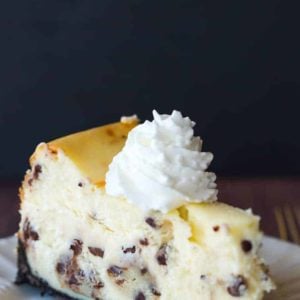 Fast forward to the cheesecake being prepped, baked, chilled and sliced. I gave a piece to my husband to see what he thought, aaaaaaaandโฆ he loved it. So did I! The cheesecake is loaded with mini chocolate chips so you get some in every bite, and then there are the large chunks of chocolate chip cookie doughโฆ itโs the perfect complement to the smooth and creamy cheesecake.