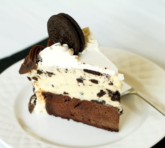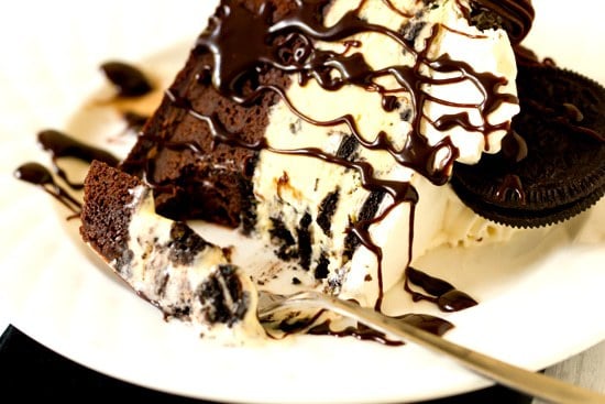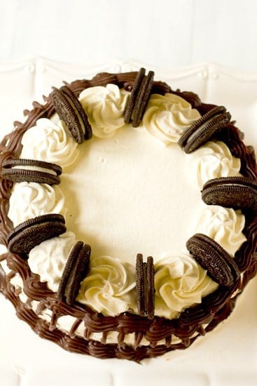 You could decorate this cake however you’d like; I chose to top it with some freshly whipped cream, and put the rest of my hot fudge sauce to good use! I used it chilled to pipe a border around the top and bottom of the cake, and then I warmed it up a little for anyone who wanted to drizzle it over their cake. Who in their right mind says no to more chocolate?! The base cake for this dessert is incredibly rich and moist, which makes it perfect for the freezer. Topped with this fantastic ice cream, whipped cream, fudge and more Oreos, the whole thing is darn near irresistible.