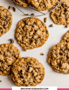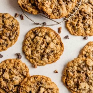I use chocolate chunks instead of chips. Sometimes, I use walnuts instead of pecans – both work well! I usually end up mixing the oats/chocolate/nuts/coconut in with my hands using food-safe gloves – these are so dense that it’s a freakin’ workout with a wooden spoon! I generally refrigerate the dough for an hour before baking. Also, I finish them with some flaky Maldon salt right after they come out of the oven. Yum.