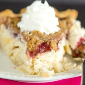 This Cranberry Cheesecake Crumb Pie features pie crust filled with a simple cheesecake batter, then topped with a thick cranberry sauce and crumb topping.