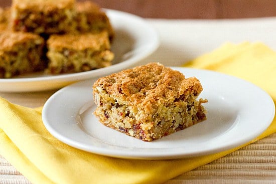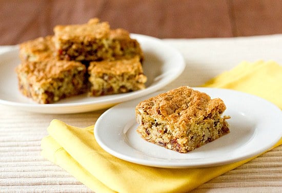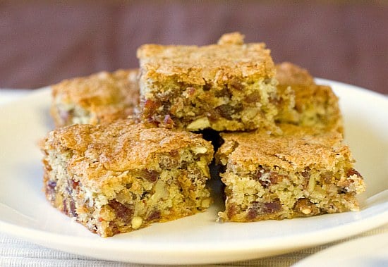 The resulting bars, as you can see, are absolutely packed full of dates and pecans. There is definitely no lack of flavor or texture here. They do have the consistency of a cakey blondie, or a good old-fashioned snack cake. I deemed them more than appropriate for breakfast on multiple occasions last week. Breakfast, dessert, snack – I’d take them any time of day.