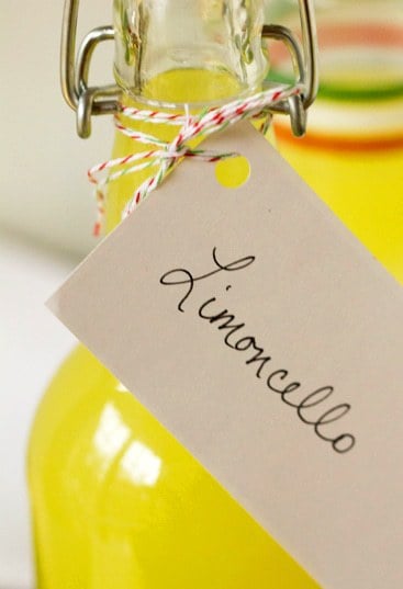 This is a relatively simple (and fun!) project. The prep is easy and the hardest part is waiting for it to be finished steeping! The final drink is extremely smooth (yet strong!), sweet and full of lemon flavor. Keep the bottles in the freezer and break out the limoncello for after-dinner sipping. You could also use it in lemon-limoncello cupcakes (yum!), or create homemade labels and gift tags and give bottles as gifts – perfect for the holidays, birthdays, housewarming or even a hostess gift instead of a bottle of wine.