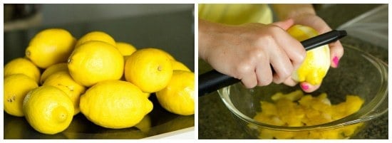 Step #1: Infusing the alcohol with the lemon. The lemons are peeled, and the peels and alcohol are combined in a large glass container. Once it’s sealed, it’s left to sit for at least 10 days, or up to three weeks.
