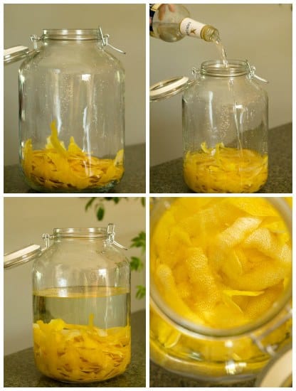 - First, wash and dry your lemons. Since you're going to be using the peel exclusively, you want to make sure they don't have any residue on them. Next, peel your lemons (a vegetable peeler works perfectly for this job) - you don't want to get too much of the white pith under the peel, so try to peel as thinly as possible. Put the peels into a large glass container. Add the alcohol, making sure that it completely covers the peels. Let the mixture steep for 10 days, or up to 3 weeks.