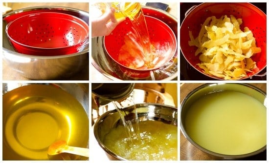 - Place a colander inside of a large bowl. Pour the alcohol mixture into the colander and drain, using a wooden spoon to press out any excess liquid from the peels. Discard the peels.