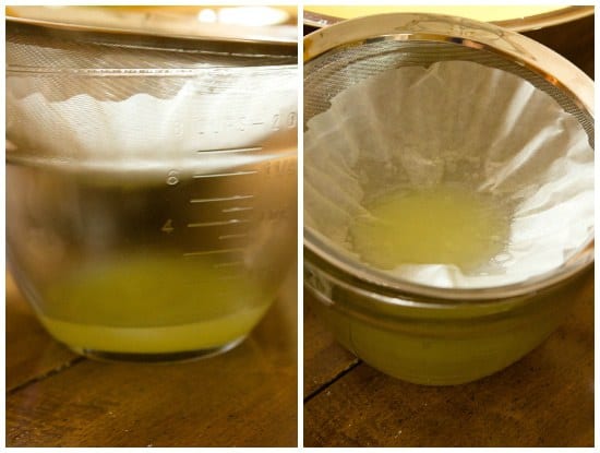 - Place a wire mesh strainer over a large, clean bowl and place a coffee filter inside the mesh strainer. Slowly pour the limoncello through the coffee filter. Once the amount of liquid straining through slows down considerably or stops, replace the coffee filter with a new one and continue until all of the limoncello has been filtered, replacing coffee filters as needed.