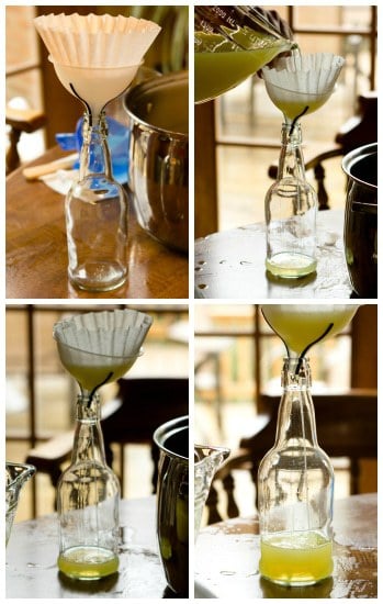 Step #4: Second filtration and bottling. This time the filtering can be done directly into the bottle(s) that you’re planning to use to store the final limoncello. Using a funnel and coffee filters, the filtering is done in the exact same manner as in step #3. The limoncello is filtered a second time to ensure that there is no sediment in the drink.