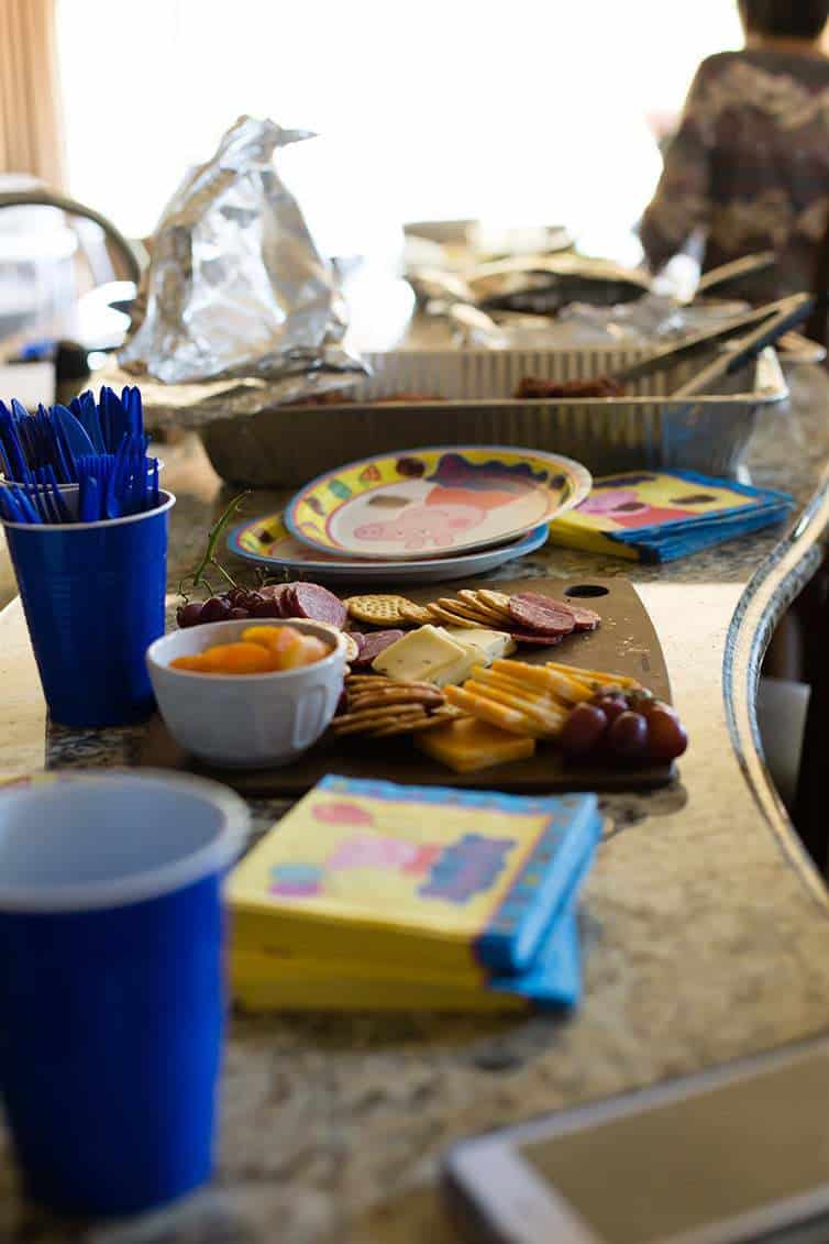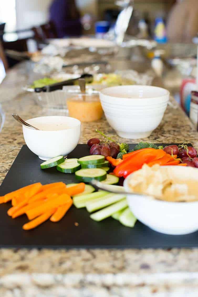 I added a cheese and cracker board with salami, sopressatta, apricots and grapes, as well as a veggie board with both ranch and hummus, and bowls of pretzels and potato chips. It was all a hit!