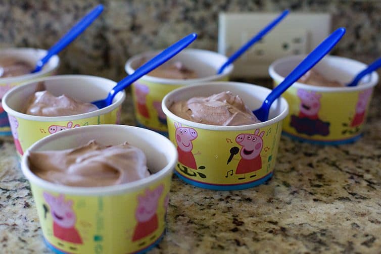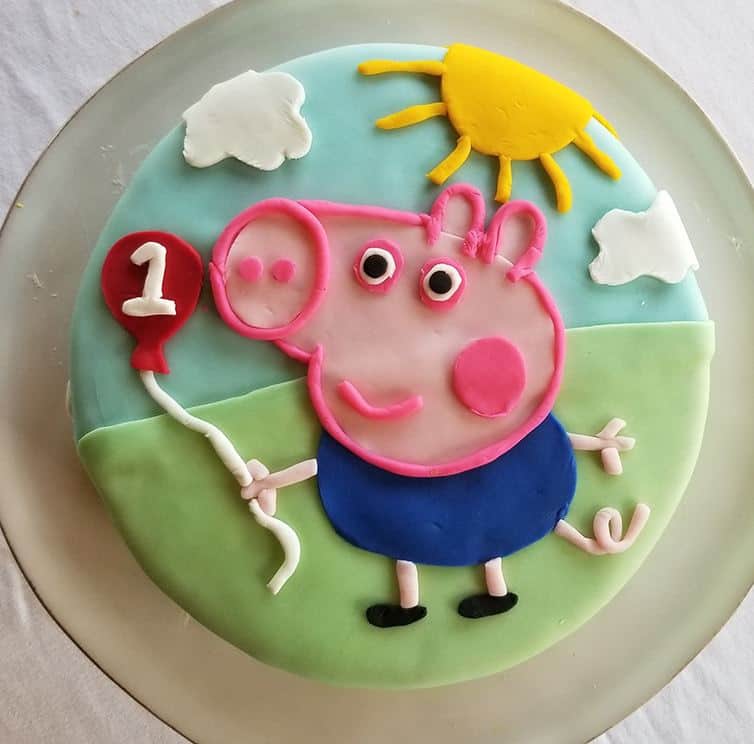 I made his cake using my yellow cake recipe, filled and frosted with my basic vanilla buttercream, and then decorated it using fondant with an image of Peppa Pig’s brother, George. I made a separate smash cake using this recipe, and decorating with a simple whipped cream frosting that I tinted using Watkins natural food coloring. I also added some dirt cups as “muddy puddles” for anyone who wanted an alternative to cake and/or something chocolate!