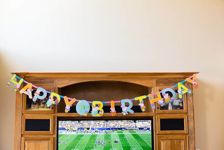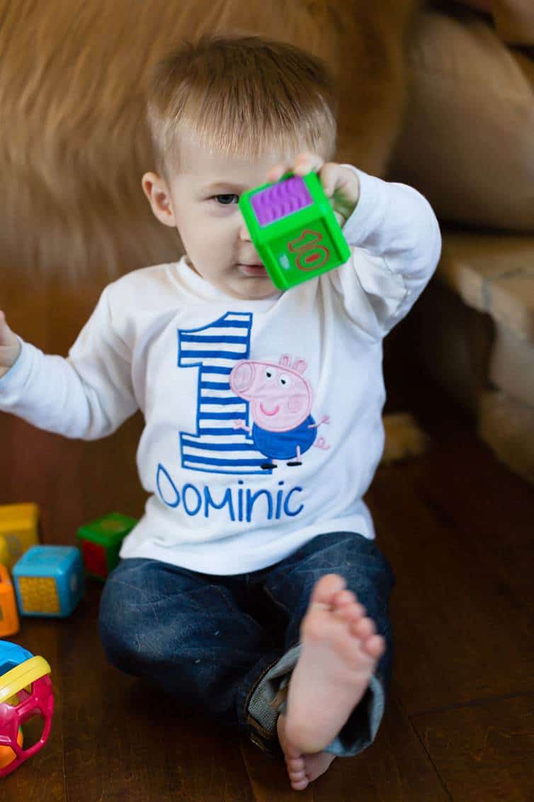 While most babies aren’t really “into” anything quite yet, Dominic took to Peppa Pig quickly when Joseph started watching it a few month ago. Through absolutely no prompting from us, he began to oink like a pig when the show would start! It made it quite easy to choose a Peppa Pig theme for the birthday party!