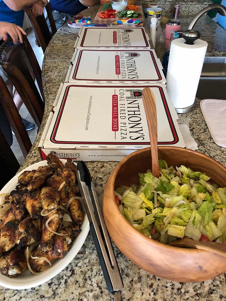 We love Anthonyโs Coal Fired Pizza, so we ordered a bunch of pizzas, wings and a tossed salad, and I put out a veggie tray, along with some chips and dips. I think everyone was pleasantly surprised by switching up the menu :)