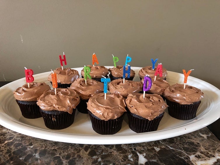 I also added a batch of chocolate cupcakes for anyone who was feeling a chocolate dessert, and popped some cute Happy Birthday candles in them (we didnโt light them, I just liked the letters for decoration!).