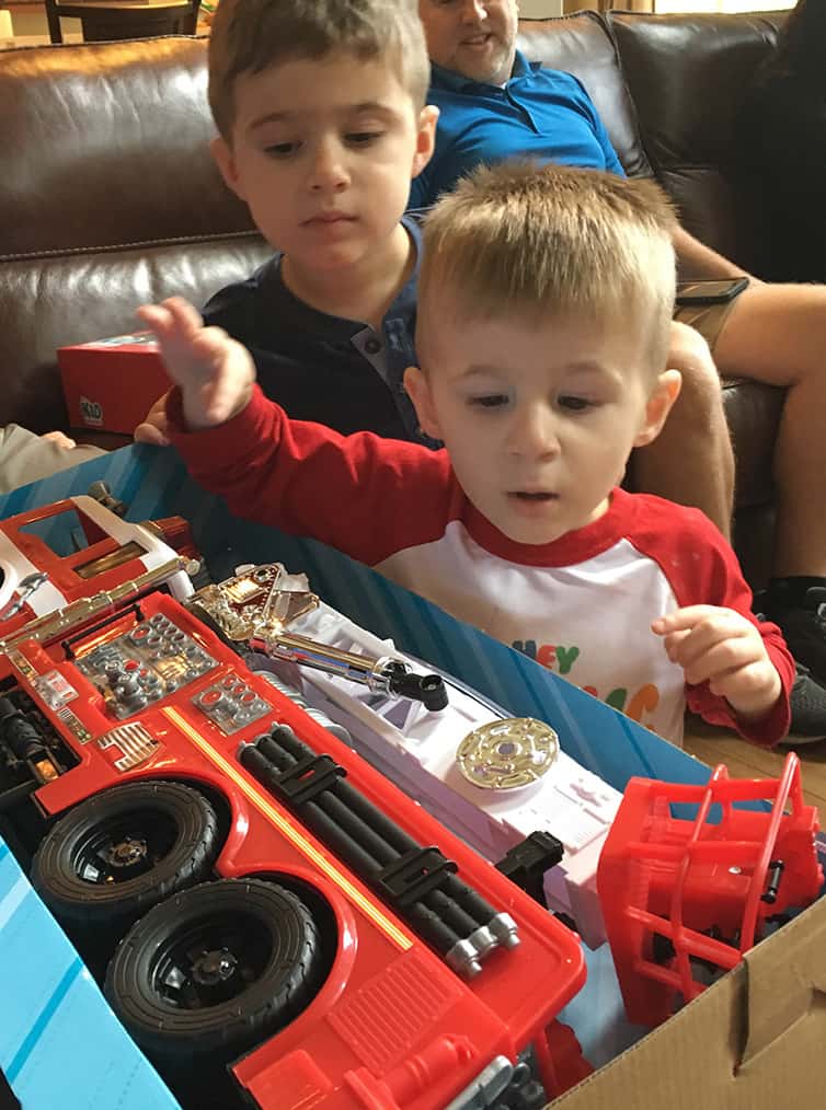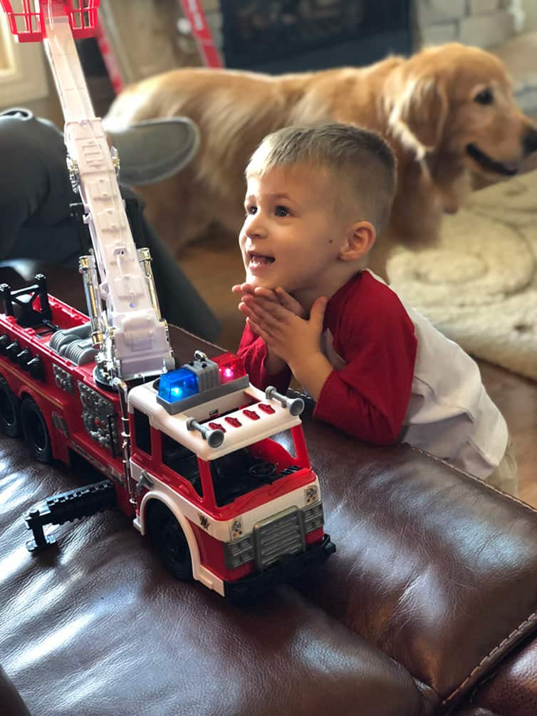 Such total joy on his face as he looks at his new firetruck. ;-)
