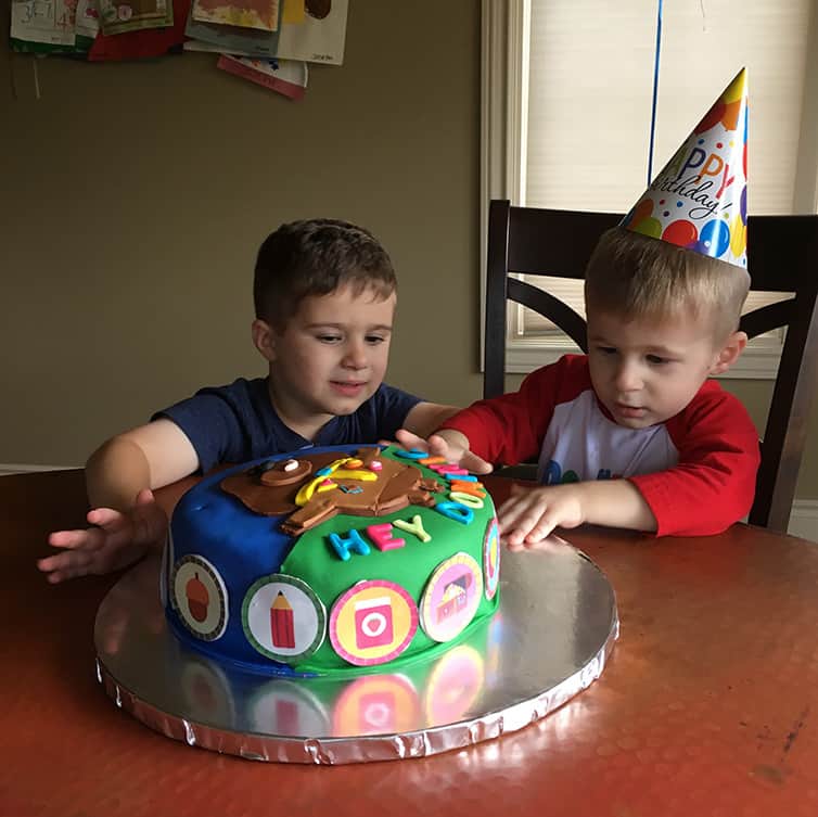 I made the main character (Duggee) in fondant, and then printed out badges from the show and put them around the sides of the cake. This was actually my favorite partโฆ after we sang Happy Birthday, Joseph and Dominic just kept spinning the cake in circles looking at all of the badges, and Joseph knew what most of them were. They were SO excited! It took awhile to have them part with the cake so I could slice it ;-)
