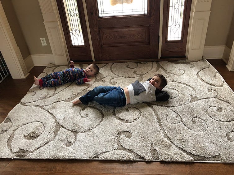 We got a new entryway rug and I am IN LOVE with it! The boys are, too โ itโs so soft and theyโve been bringing their dump trucks and cars to run along the โtrackโ designs in the rug. [Itโs this one from Wayfair.]