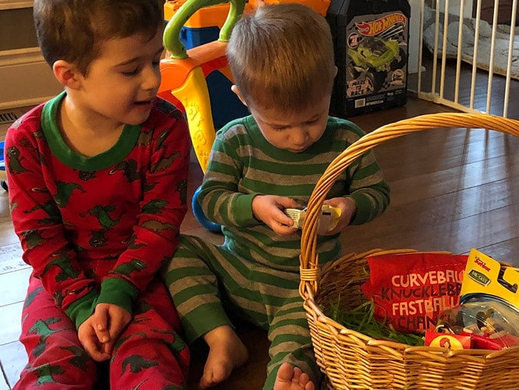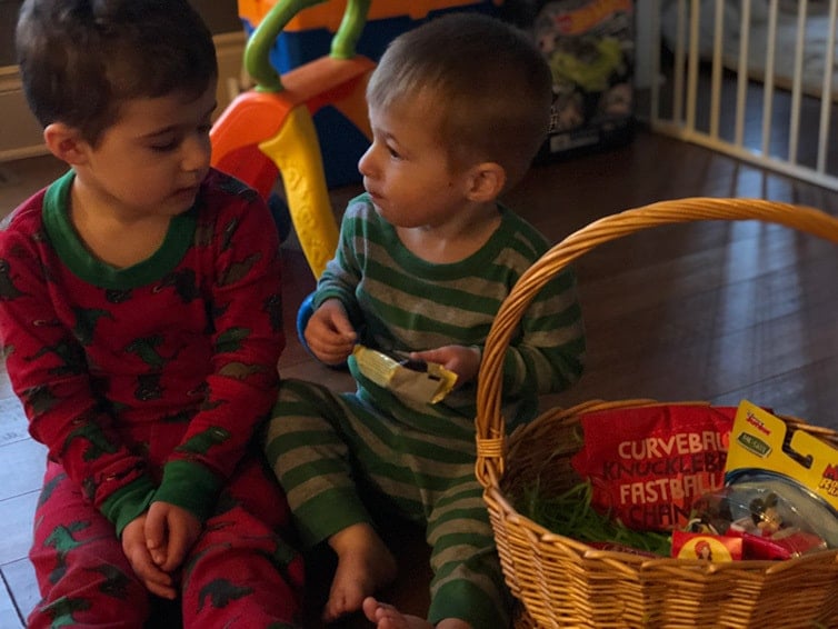 It looks very convincingly un-holiday-ish because aside from Sunday we really had a very low-key couple of days at home. My energy is waning, my feet are swollen, we didnโt have any big egg hunt, I forgot to buy WHITE eggs for coloring (doh, organic brown eggs!), and so we all just relaxed and enjoyed time together at home. We had Easter dinner at my momโs house with my in-laws and grandparents; we all had a fun day and the boys came home with tons of bunny treats.