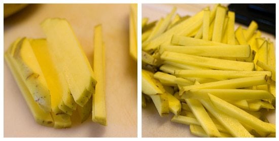 Prep is super easy โ all you need to do is get your Yukon gold potatoes and slice them up into your French fry batons, which should take less than 10 minutes.