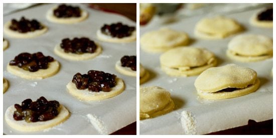 • Using about 1/3 of the dough at a time, roll out the dough on a well-floured surface to about 1/8-inch thickness. (The dough is very soft and sticky, so use as much flour as necessary to roll it out without it sticking.) Cut the dough into rounds (I used a 2ยพ-inch cookie cutter). Place one on prepared baking sheet, spoon 1 to 2 tablespoons of the raisin filling onto the circle and then top with another round of dough. Just lay the circle on top of the filling; there is no need to seal them shut, as they will do so while baking. Repeat with remaining dough and filling.