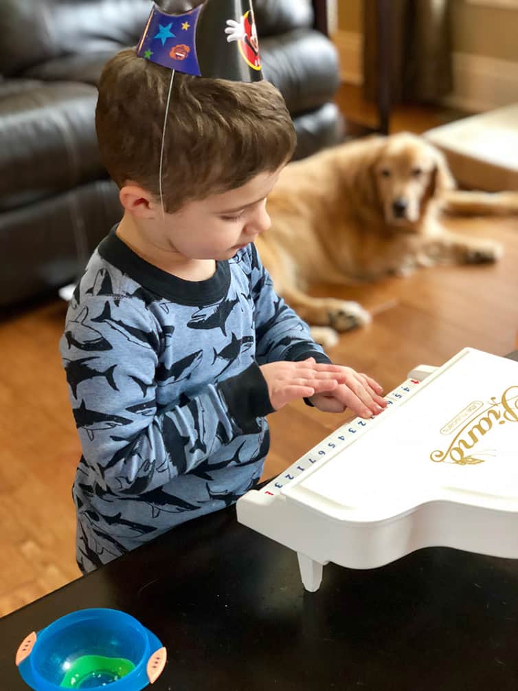 Joseph has been thoroughly enjoying all of this birthday goods. Heโs totally obsessed with race cars and all of the Hot Wheels stuff we got him has been a huge hit, but he also loves the little toy piano my mom got him, as well. He plays it multiple times a day, and on Sunday morning, he insisted on wearing a birthday hat, HA.