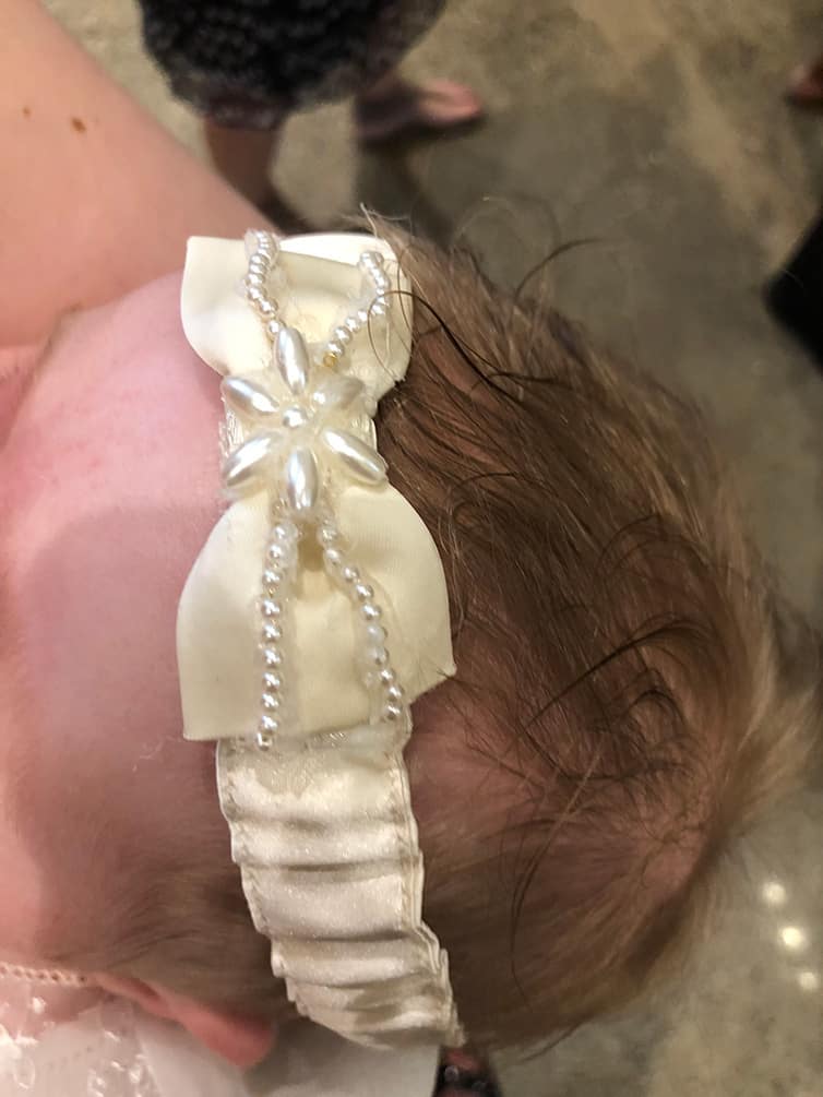 This was Isabelleโs headband โ my aunt made it with material and beading from both my momโs and grandmaโs wedding dresses. This is the same aunt who has made framed cross stitches of photos of Joseph and Dominic by the Christmas tree on each of their first Christmases โ she is incredibly thoughtful and talented.