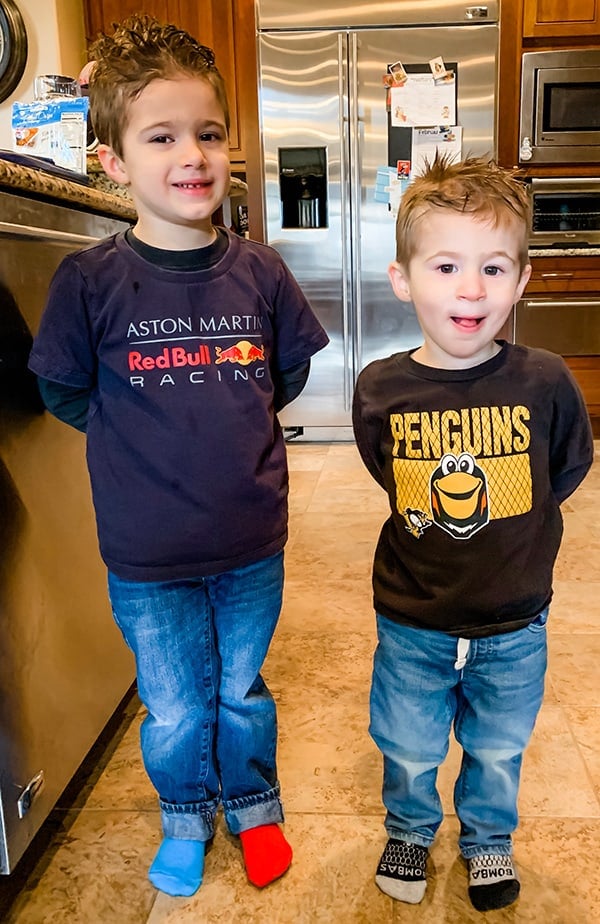 (Joseph had funky socks and wacky hair day at school this week, and Dominic wanted to play along, too :) Also, this is now what I get when I say, โsay cheese!โ)