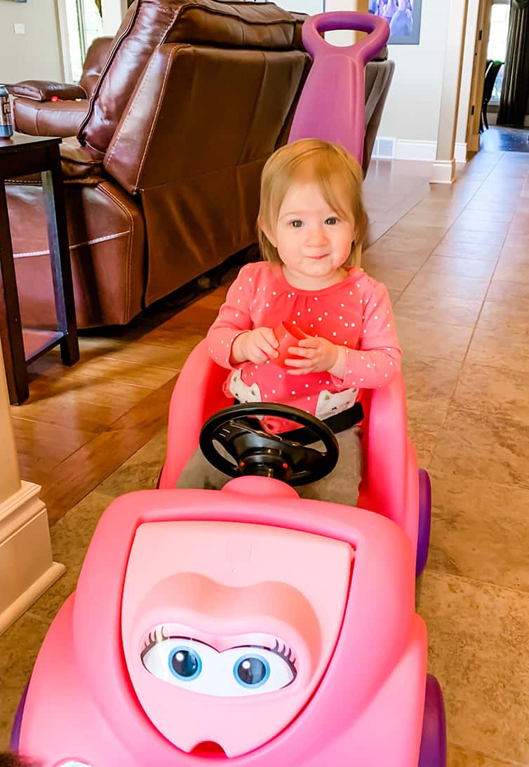 3. This little lady got her own ride and she is hysterical in this little buggy. She LOVES to ride in it and sits in there, looks around, and waves as she rides along. She pretty much reminds me of the queen, lol.